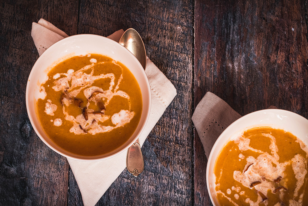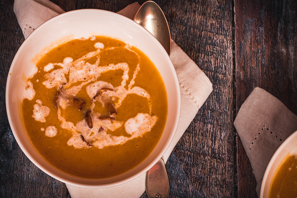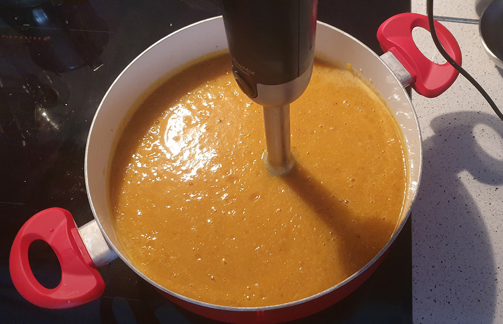 Когато всичко е сварено (не се притеснявайте ако тиквата се разпада – нали ще я правим на пюре), подправете на вкус и изчакайте да поизстине, преди да пасирате с ръчен блендер.