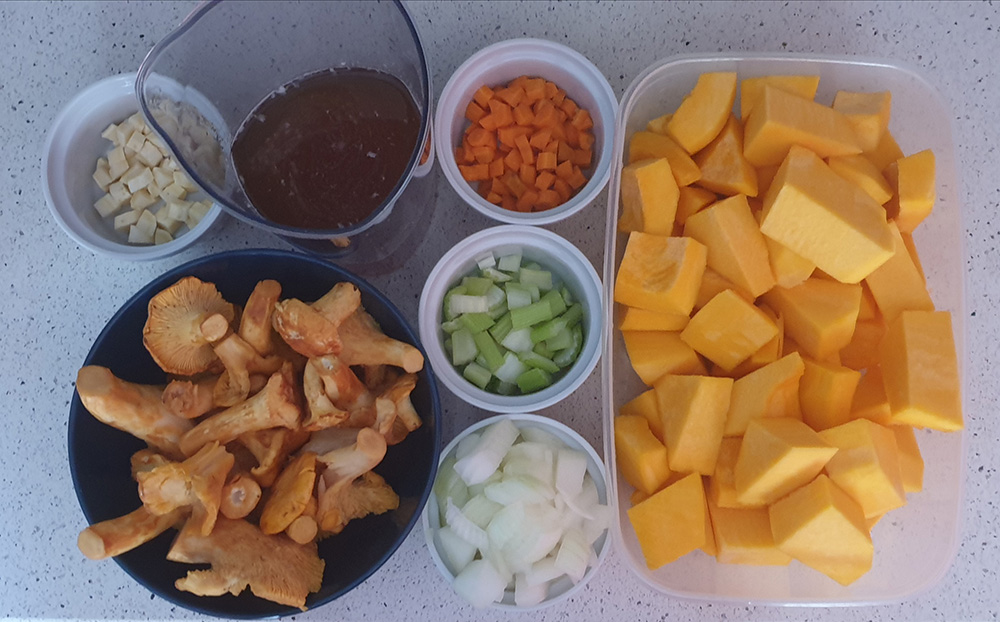 В достатъчно голяма тенджера се слагат тиквата, лукът, селърито и морковът. Сипва се бульонът и се долива с вода, колкото да покрие леко продуктите. След около 25 минути сложете гъбите (по-едрите нарязани, по-дребните – цели). Варете до омекване на тиквата и готовност на гъбите – общо около 40 минути.