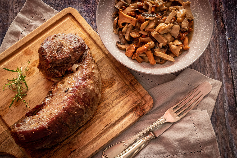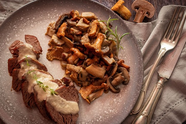 Нарежете месото на относително тънки (около 1/2 см) филийки и гарнирайте със соса. Добавете от гъбеното рагу и сервирайте, най-добре с вино по избор.