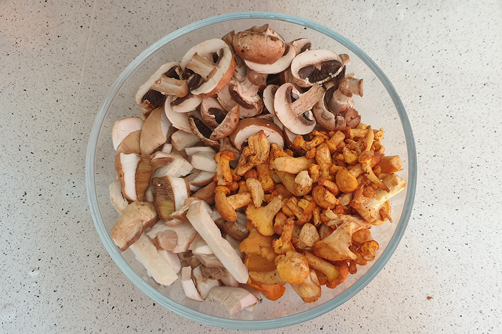 700 г гъби – аз сложих 300 г пресни манатарки, 250 г пачи крак и 250 г кралски печурки