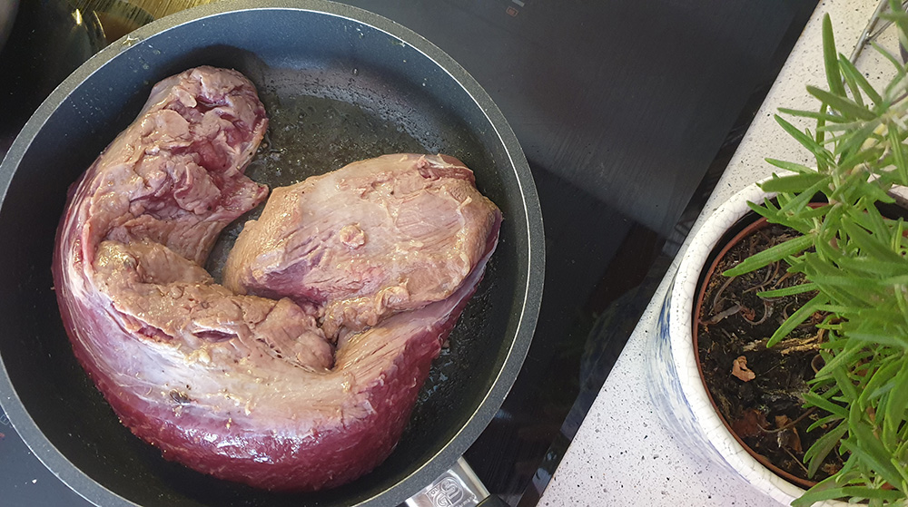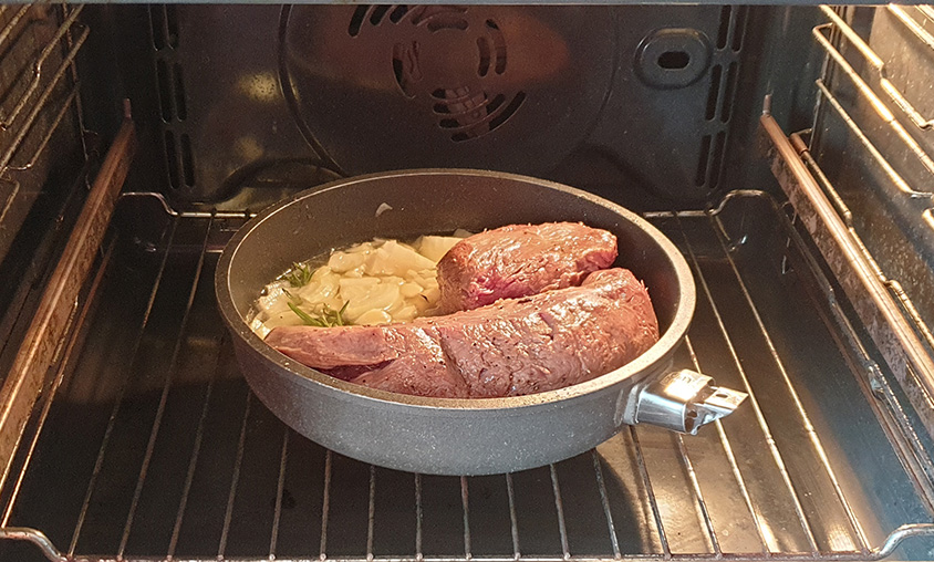 В тиган с тежко дъно, който може да се ползва във фурна, загрейте на средна степен на котлона (6 от 9) зехтина. „Запечатете“ месото от всички страни – горе долу по минута от всяка.