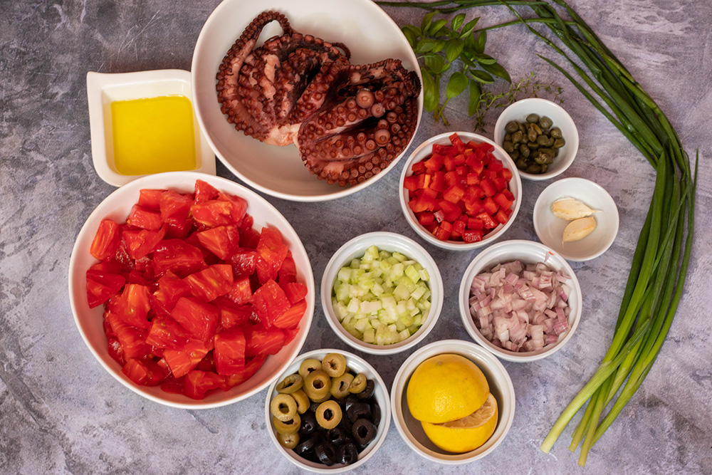 Нарежете шалота, чесъна, селъри и червената чушка на ситно. Обелете и нарежете доматите на кубчета със страна 1 – 1.5 см. Нарежете октопода на хапки и маслините на филийки. Изплакнете каперсите с хладка вода.