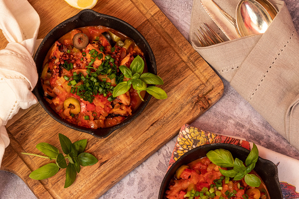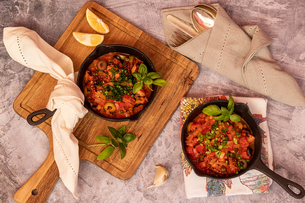 За да бъде ястието наистина средиземноморско, слагам маслини, каперси, домати и босилек. Допълнителното готвене с доматите прави октопода още по-крехък.