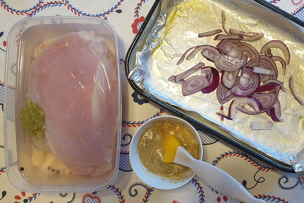 Извадете месото от саламурата, изплакнете го и го подсушете. Намажете от всички страни с горчичената смес и разположете върху лука.