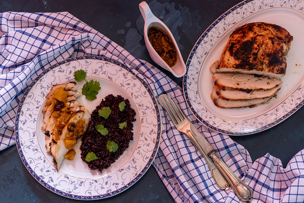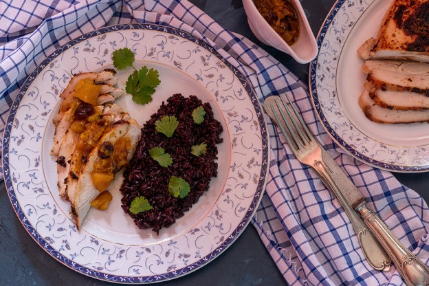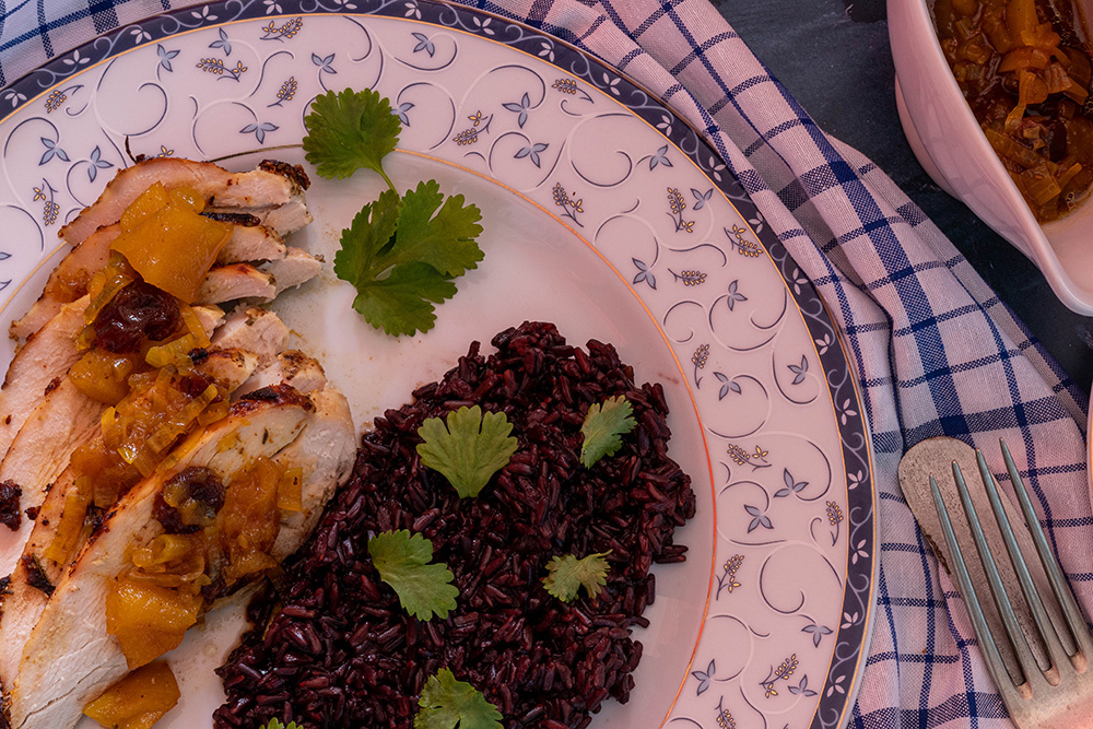 Рецептата, която ви предлагам включва чътни от ябълки и червени боровинки и черен ориз. Чътнито добавя сладко-кисели и съвсем леко пикантни нотки, които прекрасно си хармонират със земния, ядков вкус на ориза. Като цяло ястието е много балансирано, както откъм вкус, така и откъм хранителна стойност.
