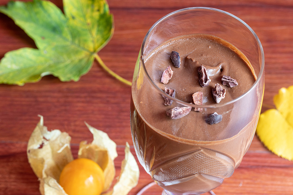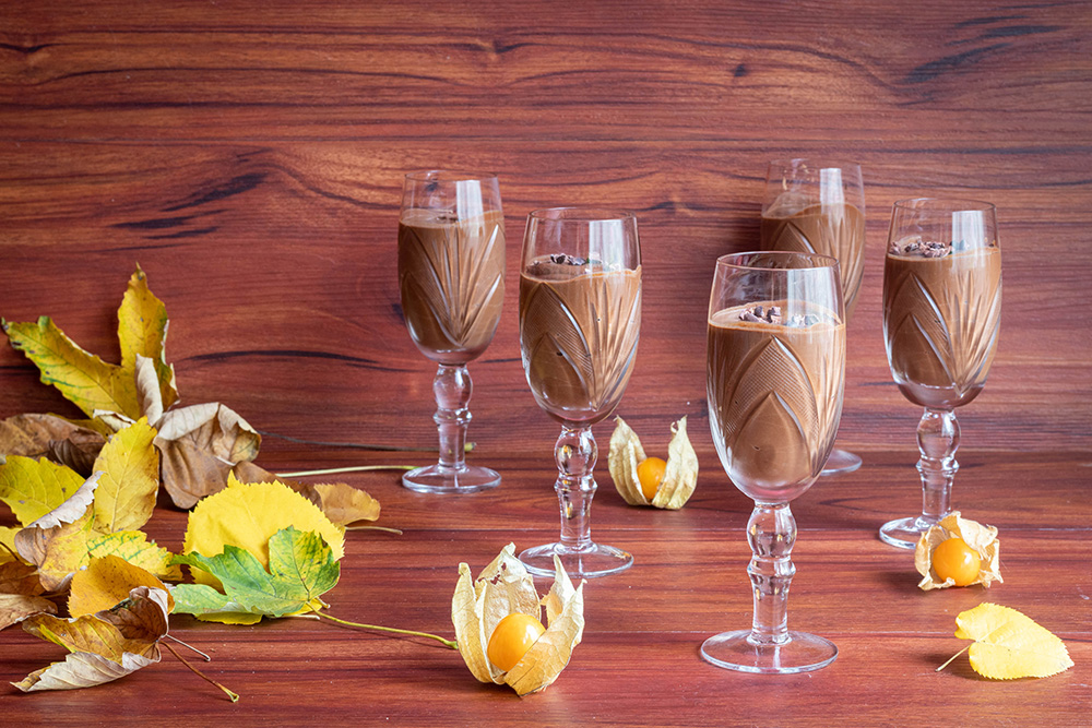 Прехвърлете в чаши, бурканчета или други подходящи съдове и охладете поне половин час преди сервиране. Гарнирайте с натрошени какаови зърна.