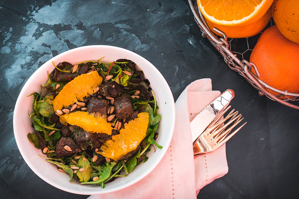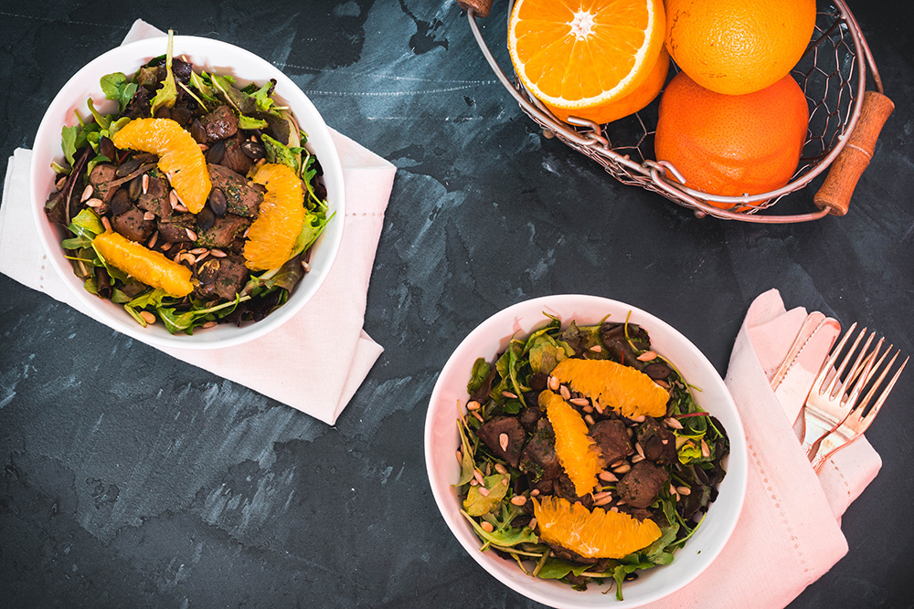 Измийте и подсушете саладките и ги подправете с останалия зехтин, лимонов сок и малко сол. Разпределете в чинии за сервиране. Отгоре добавете топлият (но не горещ) дроб, разбъркан със соса. Гарнирайте с микс семена и филета портокал.