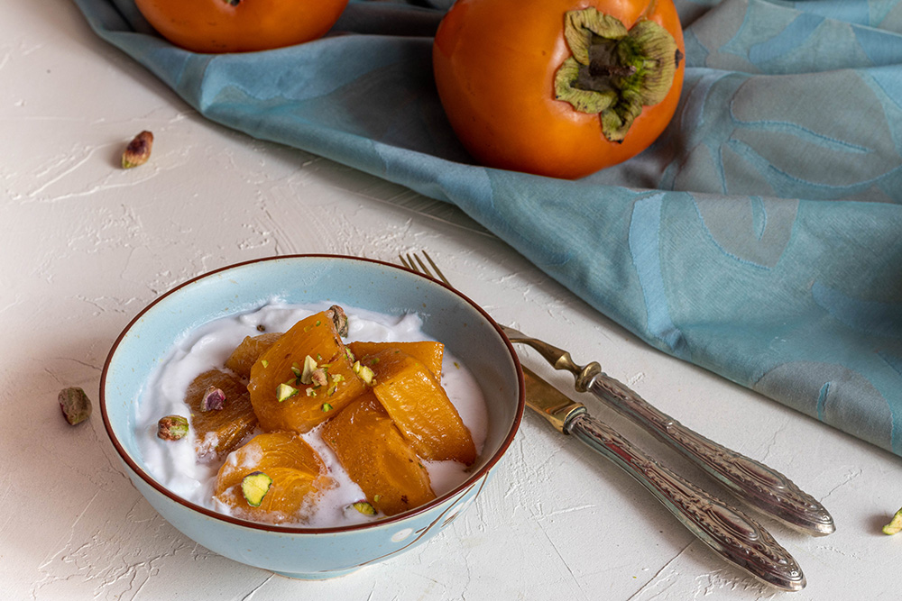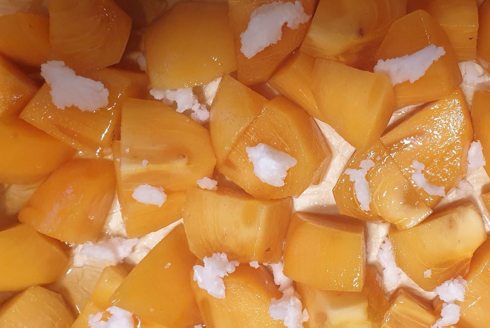 Според упътванията, най-важното за тази рецепта е да вземете верния сорт райски ябълки. Има два – fuyu и hachiya . Първият е този, който ми трябваше, защото той е сладък, дори преди да е напълно зрял и затова може да се ползва за ястия, в които минава някаква термична обработка, без да се разкашка необратимо. Вторият не се препоръчва, защото преди да узрее напълно е кисел и стипчив. Дотук добре, но се оказа (без да имам претенции да съм проверила навсякъде), че по магазините продават само от втория сорт. Е, престраших се и взех няколко ябълки, които бяха по-твърди и определено не напълно узрели. В къщи обелих и нарязах една и о, чудо – нито са кисели, нито са стипчиви 😃. Не бях планирала да ги нападна веднага, но не се стърпях.
