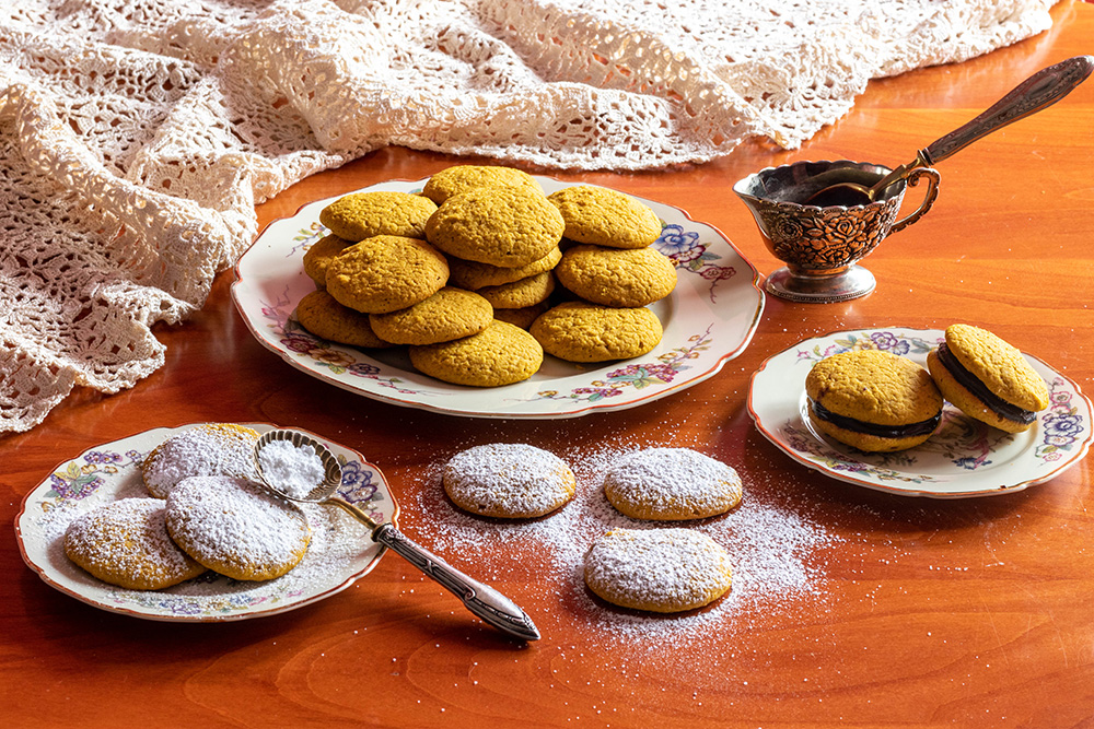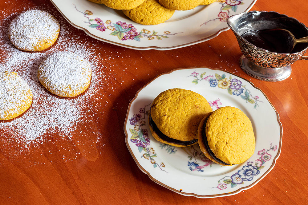 Тази рецепта е вдъхновена от beyond the yummy. Хареса ми, но, разбира се, не се сдържах и я пипнах на места. Основно замених брашното и захарта, като последното се отрази на цвета и сладките не са толкова наситено карамелени. Освен това не направих крема – прекалено много лактоза. Вместо с него, слепих сладките с шипковия мармалад на Хармоника.