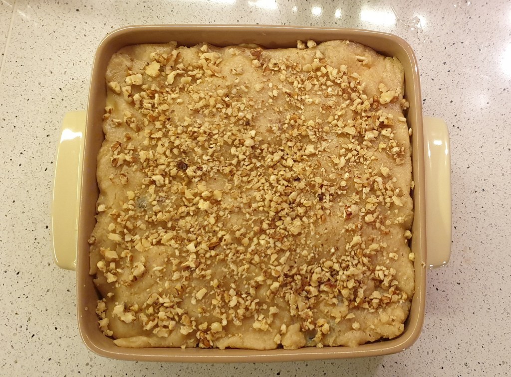 Сложете ябълките в тава с размери 20 х 20 см. Разпределете тестото отгоре – то се къса лесно, и ще има дупки – това не е проблем. Посипете орехите върху тестото.