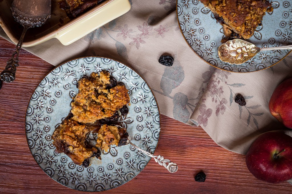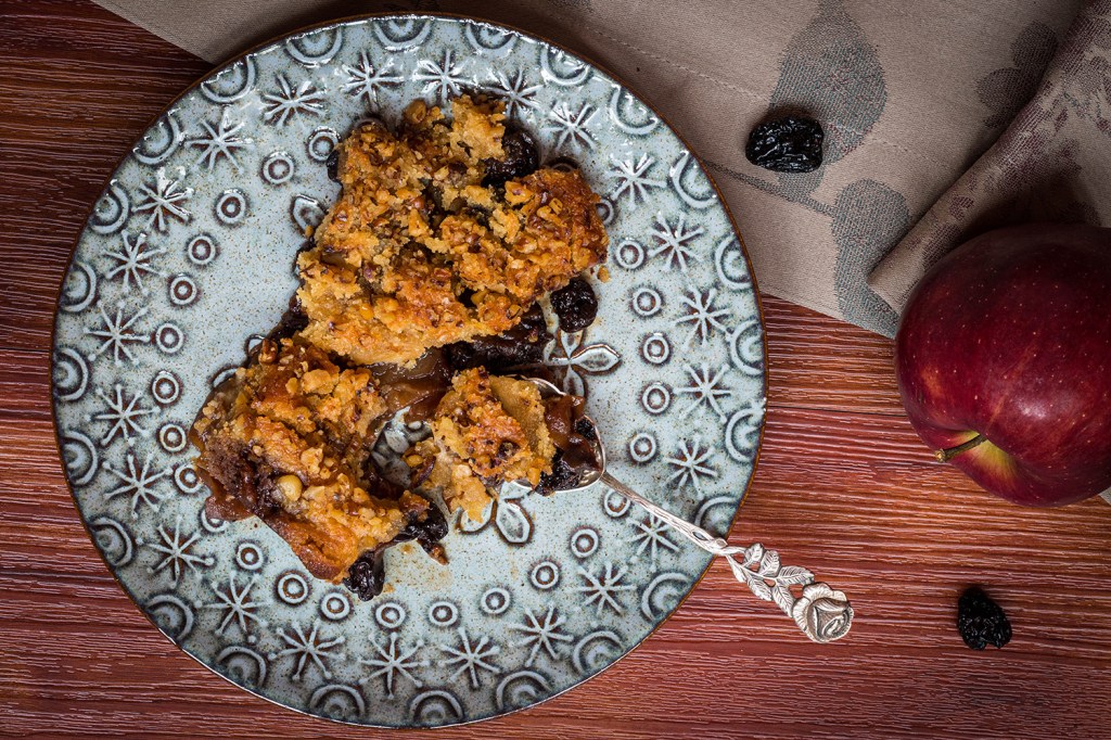 Чудя се кой ли е бил първият човек, който се е престрашил все пак да сервира леко неугледен десерт, който иначе би минал за провал от визуална гледна точка, и да му даде звучното име „кръмбъл“ (от английската дума за натрошен). Който и да е бил, добре е направил, защото макар и с несъвършена визия, този тип десерти са изключително вкусни. Стават с много и различни плодове, но нашият е с ябълки и сушени череши.