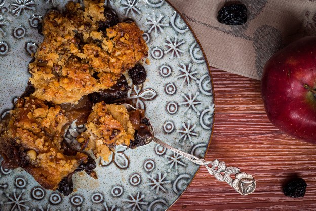Чудя се кой ли е бил първият човек, който се е престрашил все пак да сервира леко неугледен десерт, който иначе би минал за провал от визуална гледна точка, и да му даде звучното име „кръмбъл“ (от английската дума за натрошен). Който и да е бил, добре е направил, защото макар и с несъвършена визия, този тип десерти са изключително вкусни. Стават с много и различни плодове, но нашият е с ябълки и сушени череши.