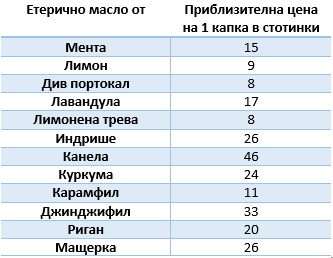 4. Цена – това може да ви изненада, но наистина е изгодно да се ползват масла. Един милилитър масло е приблизително равен на 18 – 20 капки. В едно шишенце от 15 мл имаме 270 – 300 капки. В дадена рецепта обикновено се влагат 2 – 3 капки (понякога дори само една). За пример ще ви дам приблизителната стойност на една капка от някои масла, в стотинки: