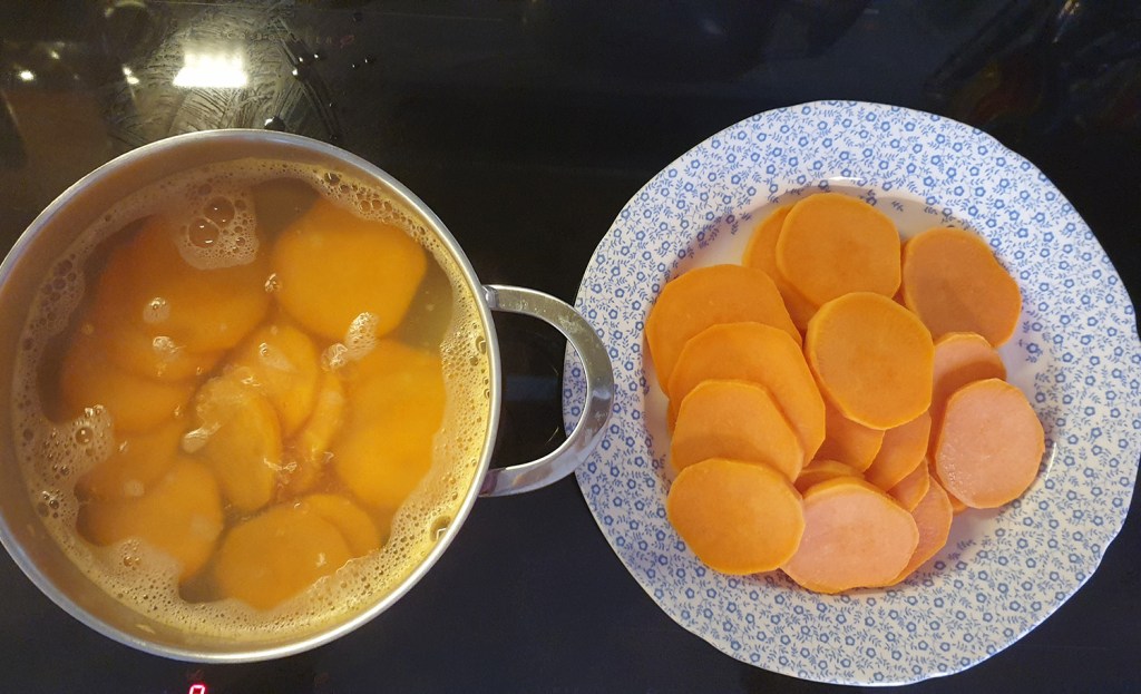 1 кг сладки картофи (два големи) – след обелване и отстраняване на крайните малки шайби остават около 700 г