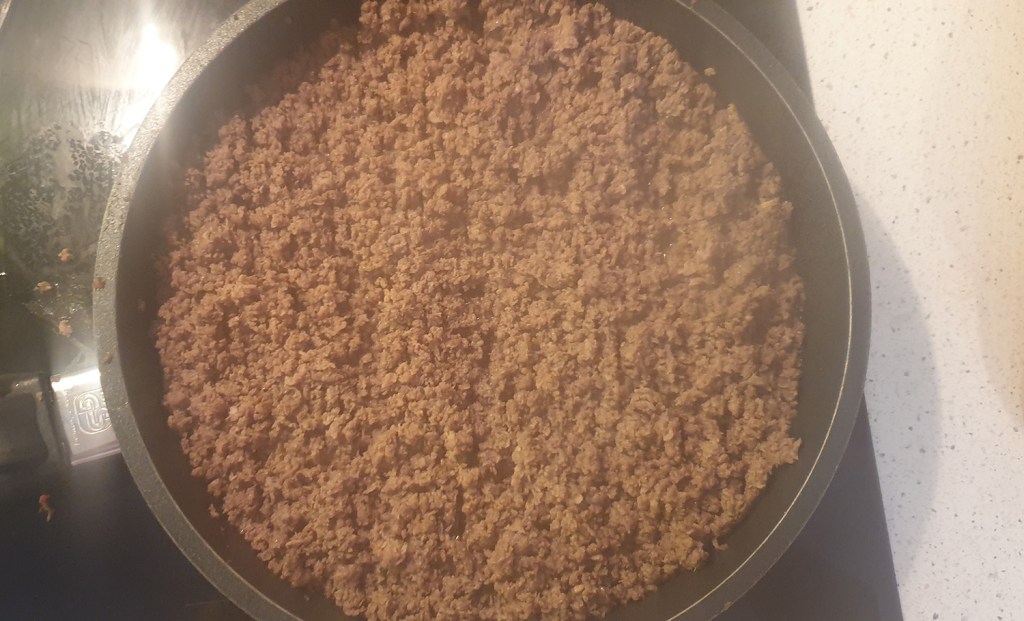 В достатъчно голям дълбок тиган загрейте 2 с.л. зехтин на средна степен на котлона. И тук е една от разликите със стандартния процес – започнете с каймата. Увеличете температурата малко над средна степен и гответе докато не остане нищо розово/червено, месото придобие приятно кафяв цвят и стане на „трохи“.