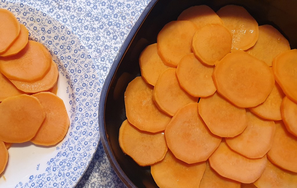 - По-голямата част от сладките картофи, като застъпвате резените, за да не остава празно място.