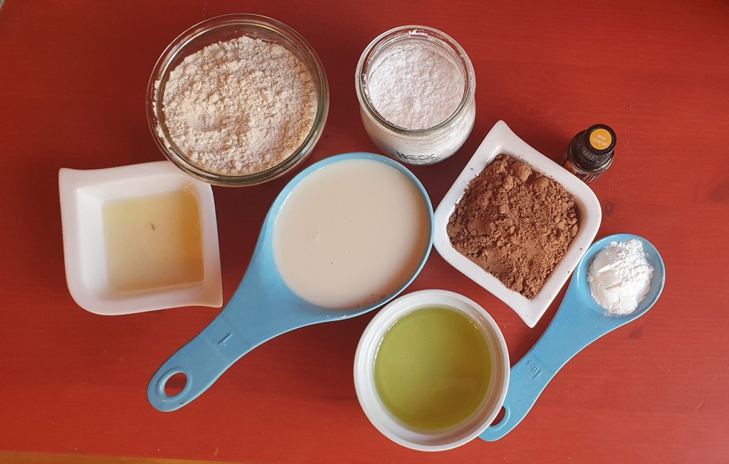 В достатъчно голяма купа пресейте брашното, какаото, еритритола, содата и солта. В друга купа смесете лимоновия сок, олиото, бадемовото мляко и маслото от портокал. Изсипете при сухата смес и разбъркайте до хомогенизиране.