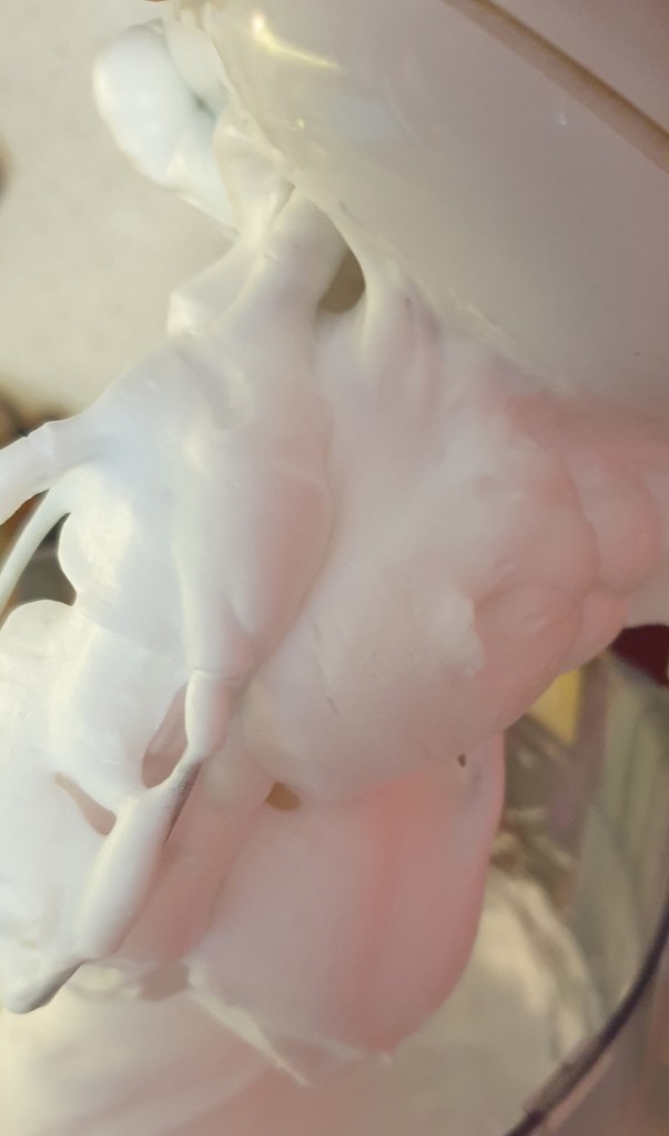 В купата на миксер сложете aquafaba, лимоновия сок и ксантановата гума и разбийте на ниска до средна скорост (3 от 8 степени) около 2 минути. Започнете да добавяте еритритола лъжица по лъжица и последно добавете маслото от див портокал. Продължете да разбивате на същата скорост още около 5 – 6 минути, докато сместа стане пухкава. На снимката виждате как изглежда след като приключих на 7.5 минути от началото.