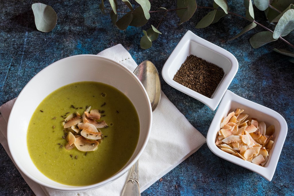 Разпределете в чинии за супа и гарнирайте със запечените семена и кокосов чипс.