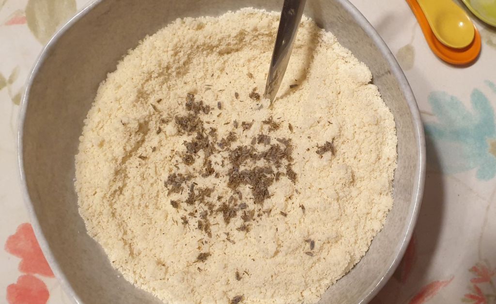 В достатъчно голяма купа смесете добре брашното, еритритола, бакпулвера и солта. Добавете сухата лавандула (може да я разтриете между пръстите си) и кората от лимон (ако ползвате). Разбъркайте.