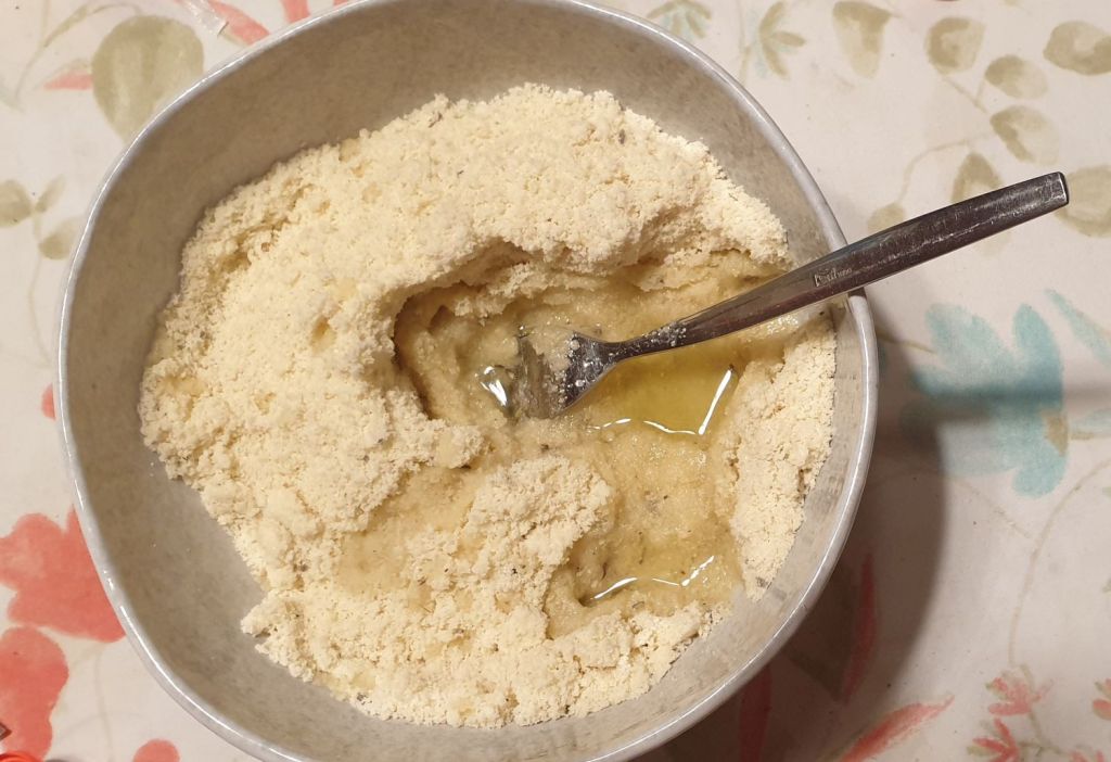 Добавете олиото и етеричните масла и разбъркайте първо с лъжица, след това с пръсти и омесете меко, ронливо тесто.