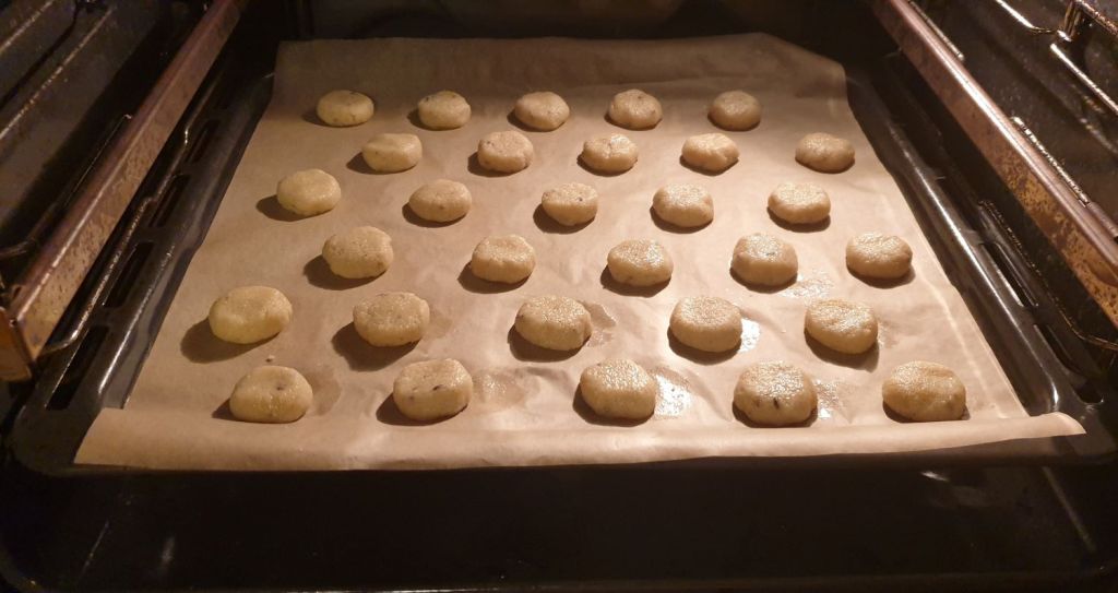 Оформете топчета (10 – 11 г всяко), разположете на известно разстояние в тавата и сплескайте леко. Печете 11 – 12 минути.
