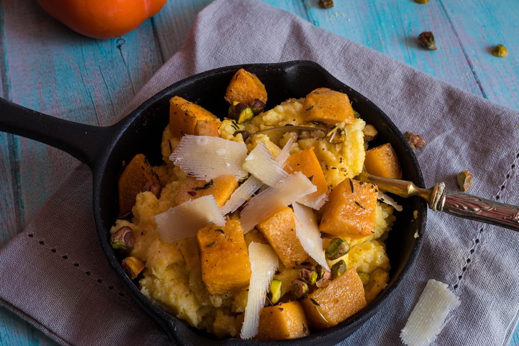 Разделете полентата между две чинии. Добавете по половин от печената райска ябълка, заедно с отделените сокове. Гарнирайте с печен шам фъстък и пармезан.
