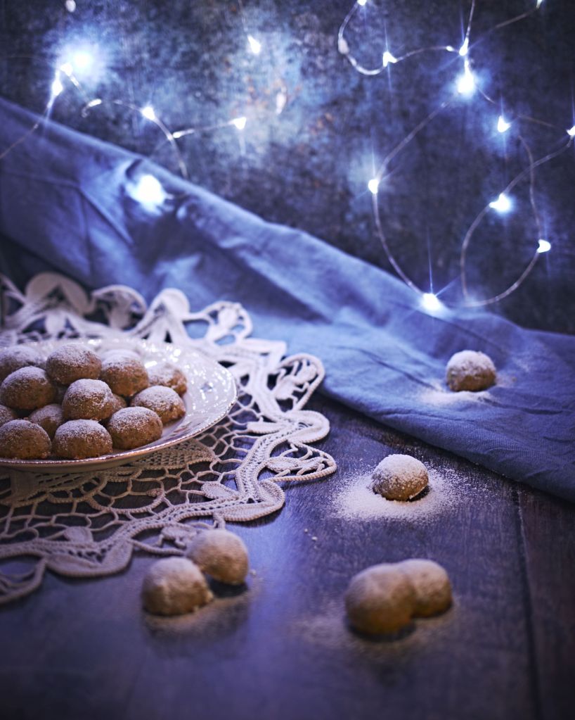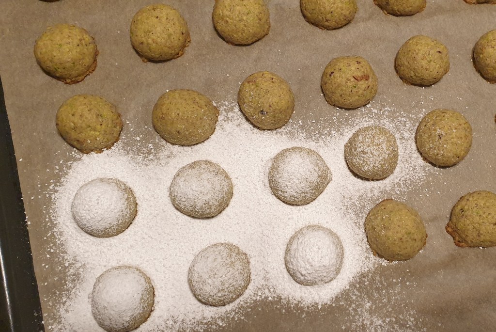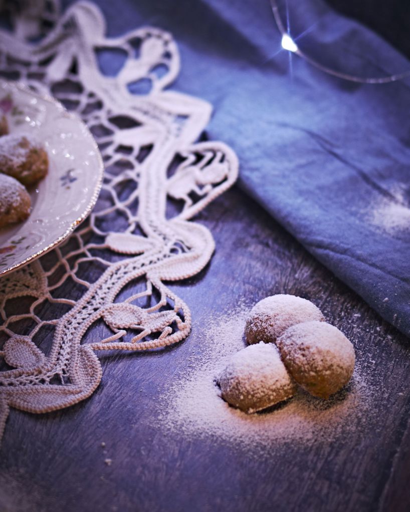 Тук формата и процесът са максимално опростени, за да ни остане време за всички дейности по подготовка за празниците. И за да се връзват с Коледно – снежното настроение, ги овалваме в смлян на пудра еритритол (който може да се замени с ксилитол или бяла захар).