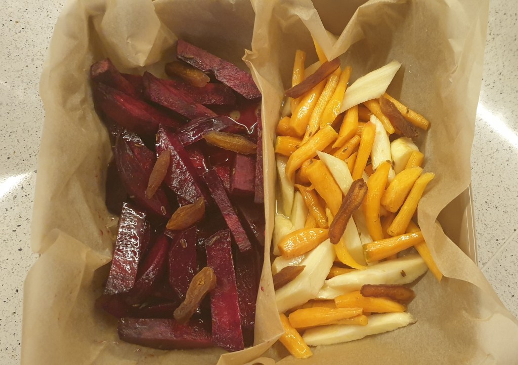 Загрейте фурната на 180 градуса и пригответе тава, покрита с хартия за печене. Обелете и нарежете цвеклото и пащърнака на резени от около 1/2 до 1 см. Нарежете резените или на 4 ако са много големи, така че да получите пръчици. Нарежете и пръчиците, така че да не са над 3 – 4 см дълги. Ако имате бейби моркови, ги почистете. Обелете ги само ако има нужда. Срежете на половина по диагонал, ако са по-големички. Ако слагате големи моркови, обелете и нарежете като пащърнака.