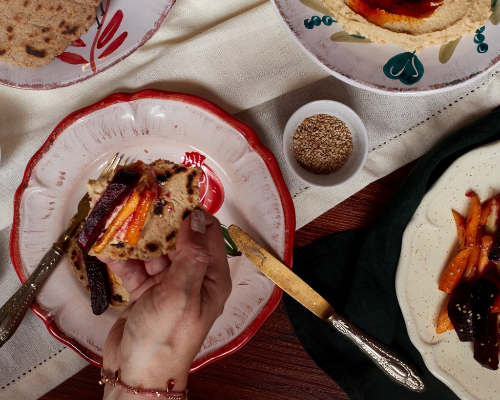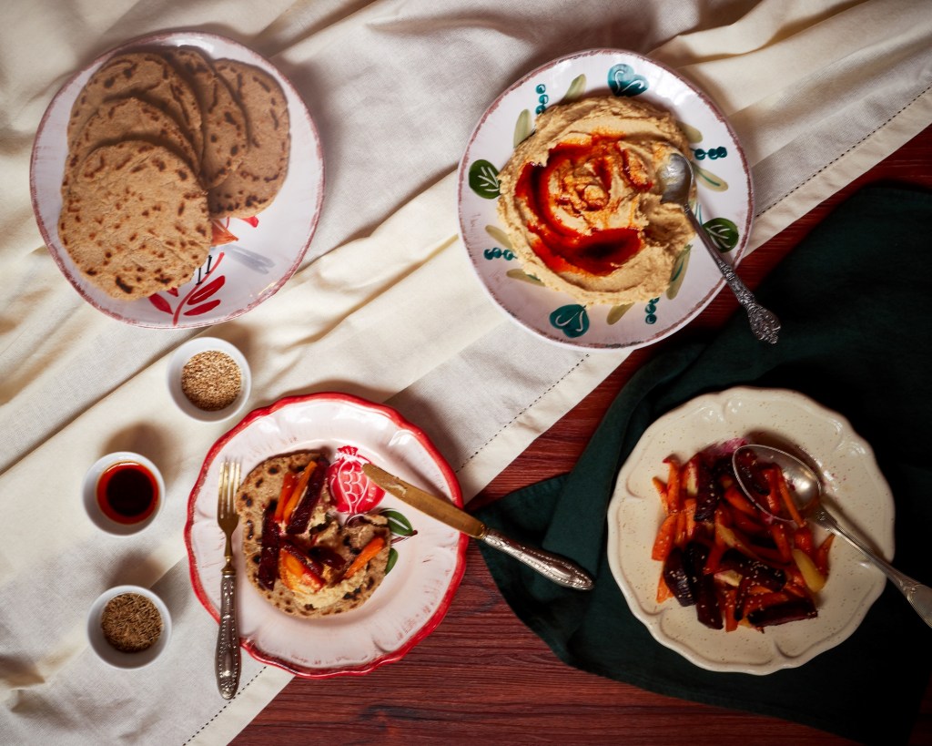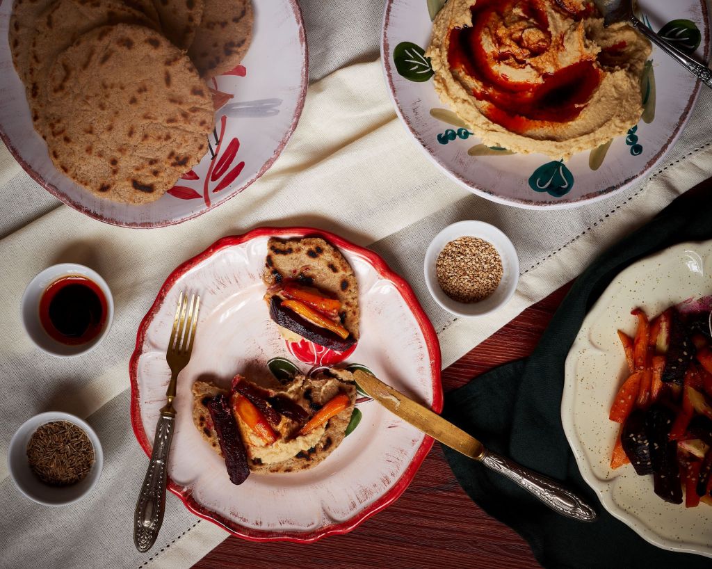 За тази рецепта ви предлагам да съчетаете хумуса с безглутенови веган питки с кимион и глазирани кореноплодни. Правят се много лесно и подхождат прекрасно на хумуса. Кимионът и сусамът присъстват в всеки от трите отделни компонента и така ги обединяват в едно ястие.