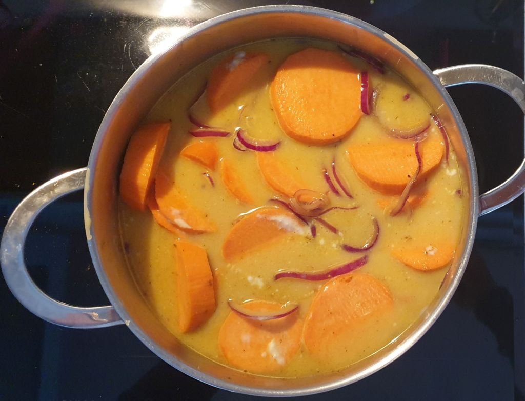Добавете сместа подправки „баланс“ и разбъркайте. Добавете сладките картофи и морковите, кокосовото мляко, Gimber и вода/бульон, колкото да покриете зеленчуците – около 2 чаши. Варете докато картофите и морковите омекнат – около 20 минути.