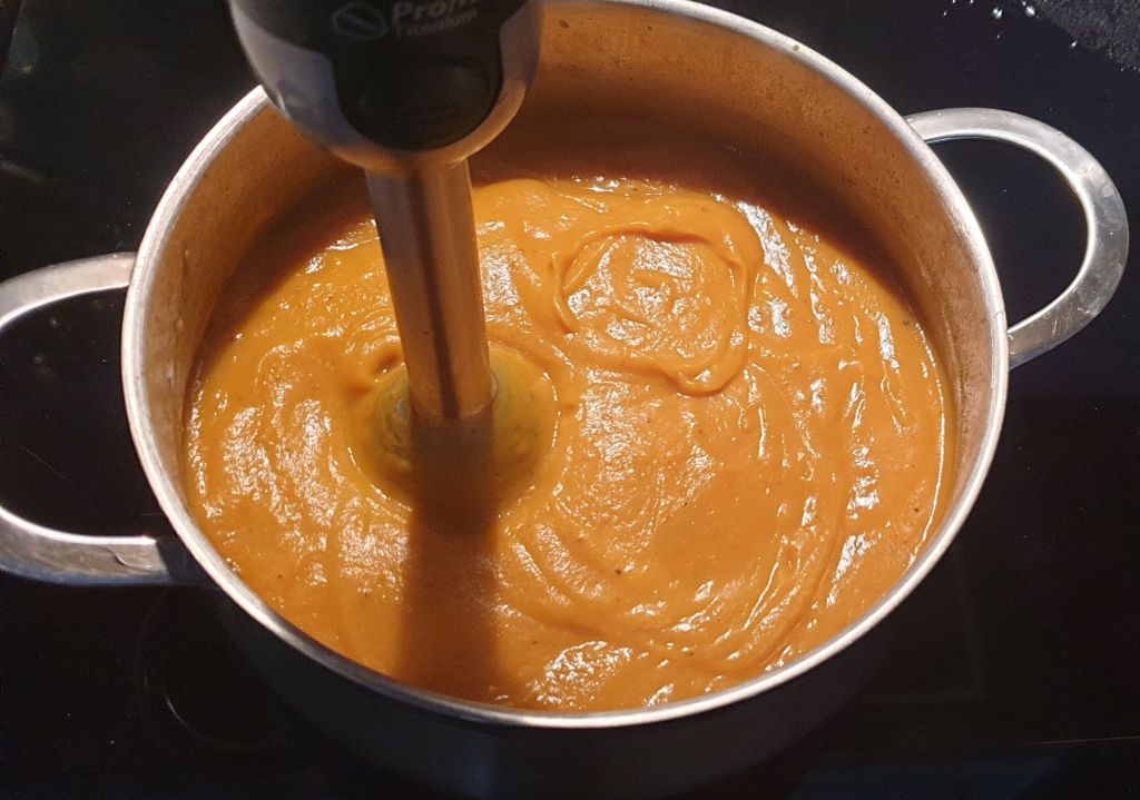 С ръчен блендер (или в чашата на блендер, който е подходящ за горещи продукти) смелете на гладко пюре. Ако е необходимо, добавете още вода/бульон, за да улесните блендера.