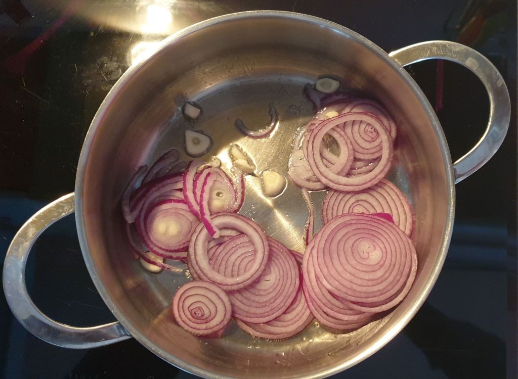 В тенджера с дебело дъно загрейте кокосовото масло. Добавете лука и чесъна (и настъргания пресен джинджифил, ако ползвате такъв) и гответе около 2 – 3 минути.