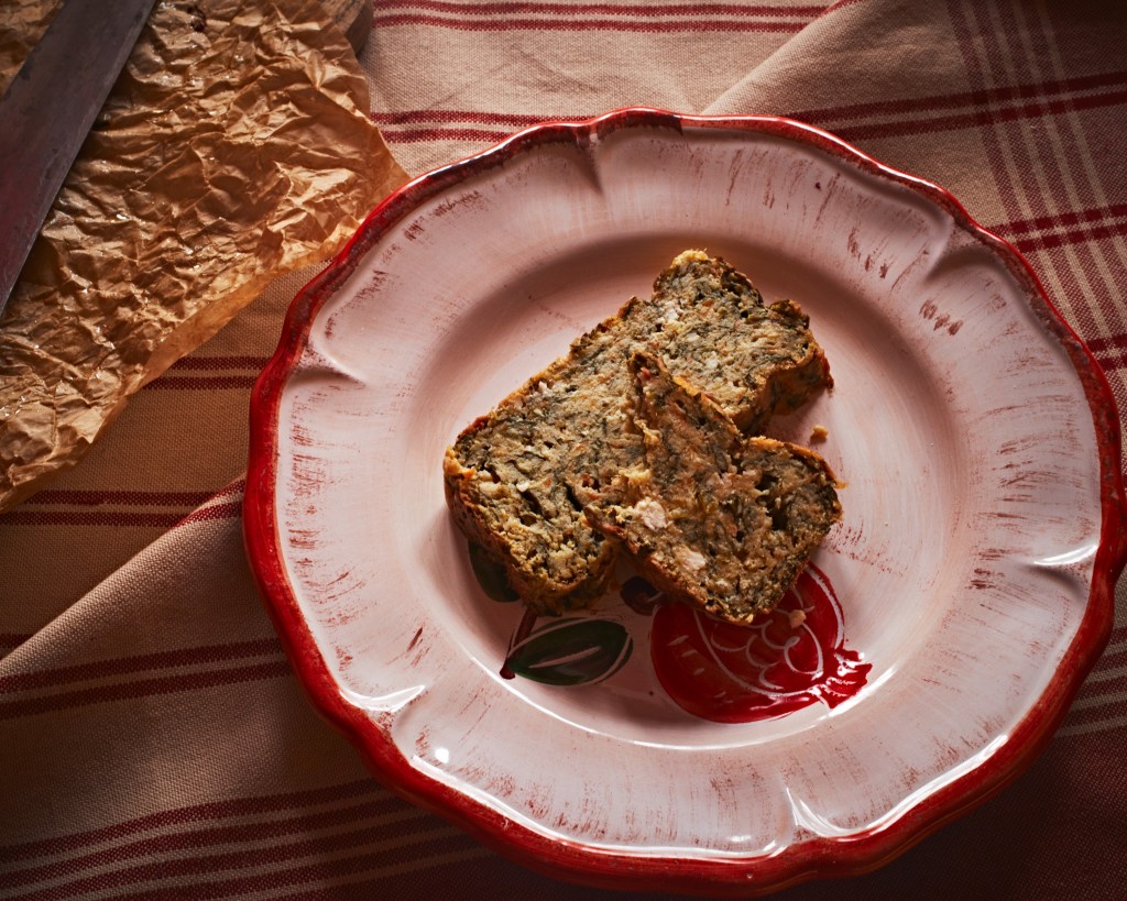 Омесете с ръце. Тестото е лепкаво и основно от зеленчуци, но хуска го споява. Прехвърлете го във формата и печете 60 минути.