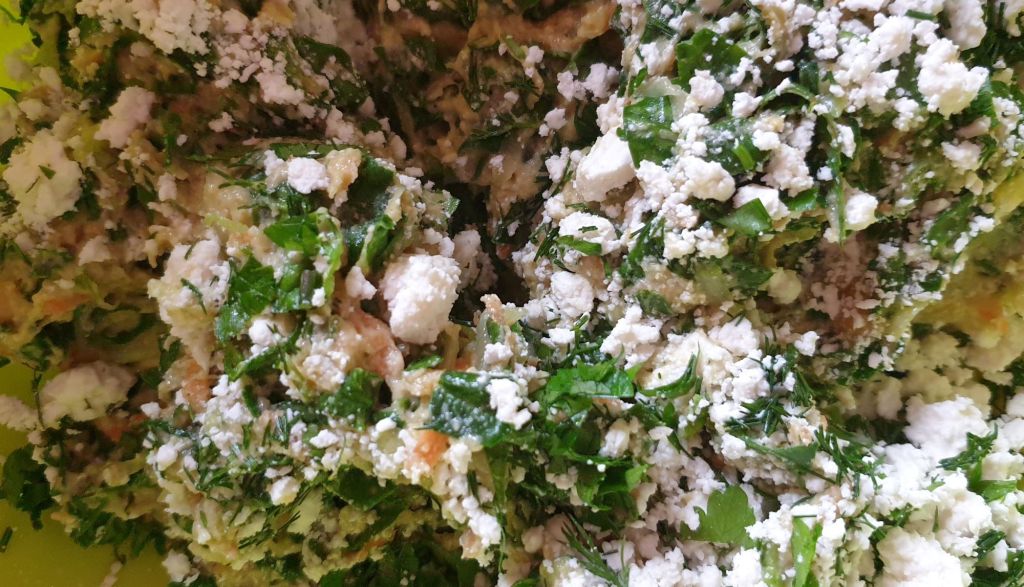 След това добавете зеленчуците, ситно нарязаните копър и магданоз и натрошеното сирене.