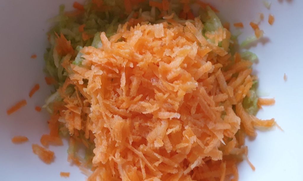 Измийте, обелете и настържете морковите. Може да ги добавите в купата при тиквичките.