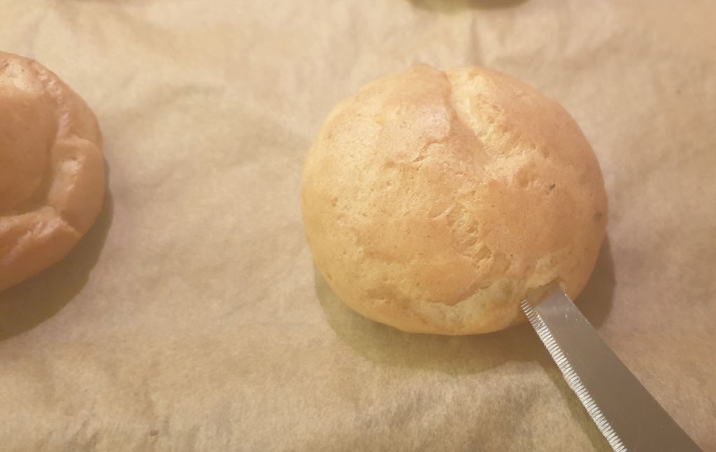Извадете тавата от фурната и с остър нож пробийте дупка във всеки един. Това е много важно, защото така даваме възможност на останалата излишна пара да излезе. В противен случай еклерите ще се овлажнят отвътре.