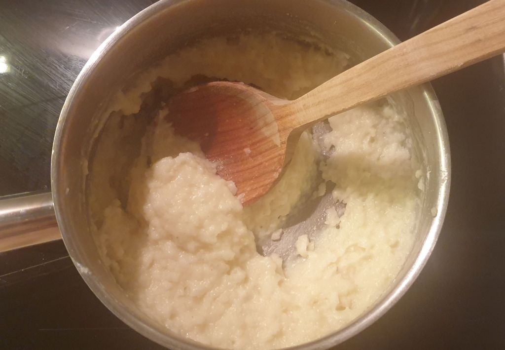 Когато заври, мръднете от котлона и добавете брашното. Разбъркайте бързо с тел или лъжица, докато се поеме брашното и върнете на котлона. Продължете да бъркате още около минута – две, докато тестото започне да се отделя от стените и да образува тънък слой по дъното.