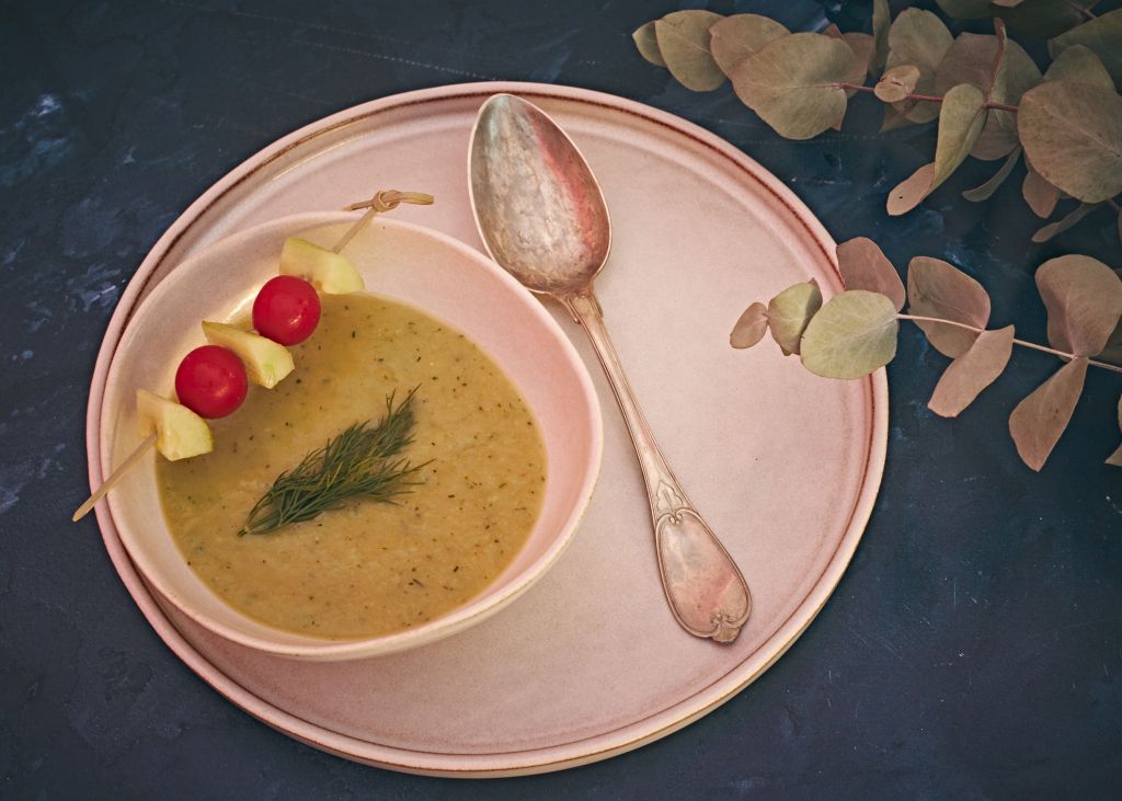 Обелете и нарежете краставицата и авокадото. Нарежете селъри. Сложете ги в блендер и добавете копъра, сол и черен пипер и около 1/3 от бульона. Блендирайте до гладка или леко зърнеста смес, според предпочитанията си. Ако е прекалено гъсто, добавете още бульон, но не всичкия – така по-лесно ще постигнете желаната текстура.