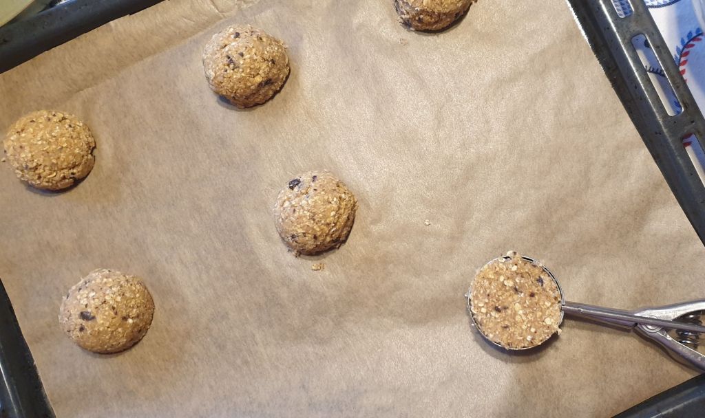 С лъжица за сладолед (или друга подходяща) оформете 10 бисквити и ги разположете на равномерно разстояние една от друга.