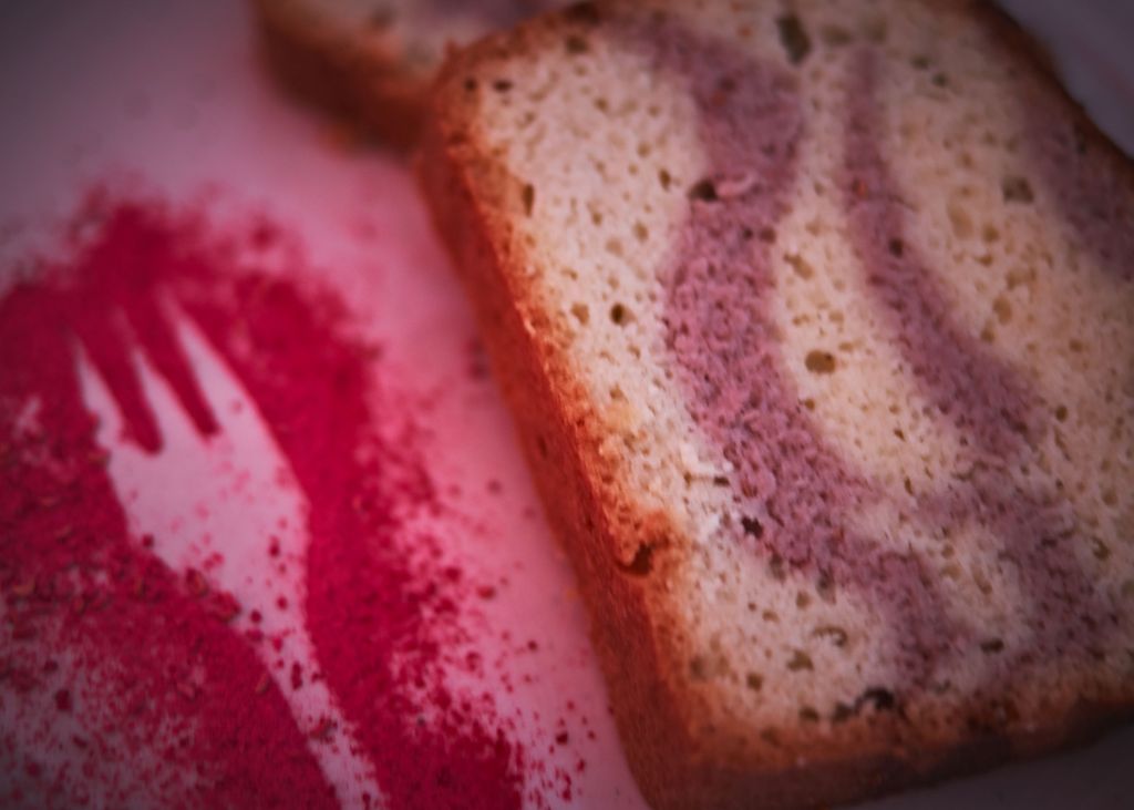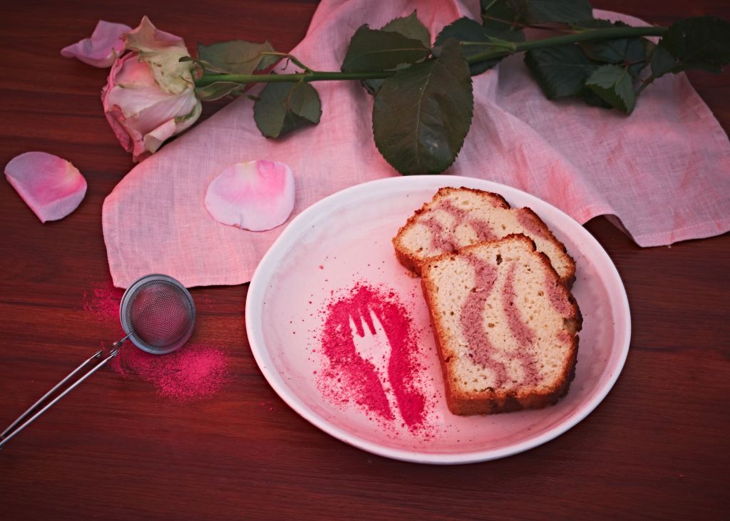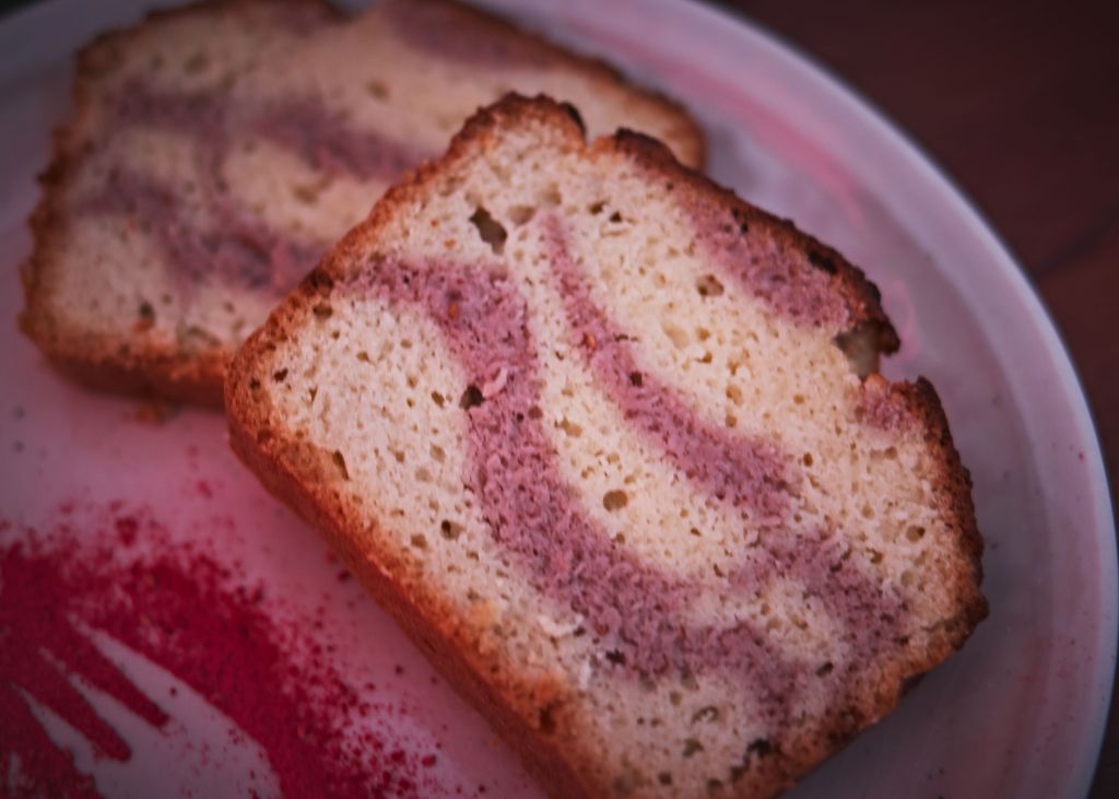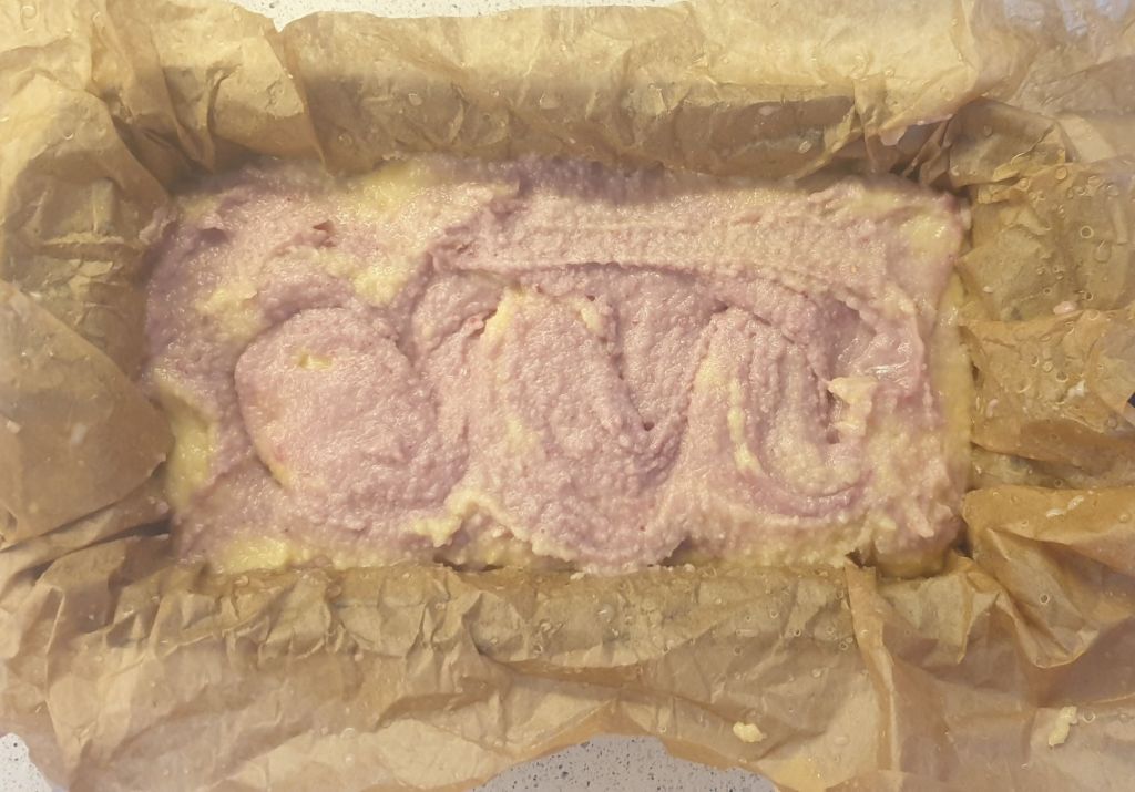 Във формата сипете първо няколко лъжици от светлото тесто и разнесете, такаче да покрие цялата площ. След това сложете малко от малиновото тесто, без да разнасяте. Отгоре сложете пак от светлото. Продължете така, докато прехвърлите всичко. След това разклатете леко формата, така че тестото да се заравни. Вземете дървен шиш (може да ползвате и дръжката на лъжица), потопете в тестото в единия край на формата и опишете вълнообразна линия по дължина на формата, за да получите мраморна окраска.