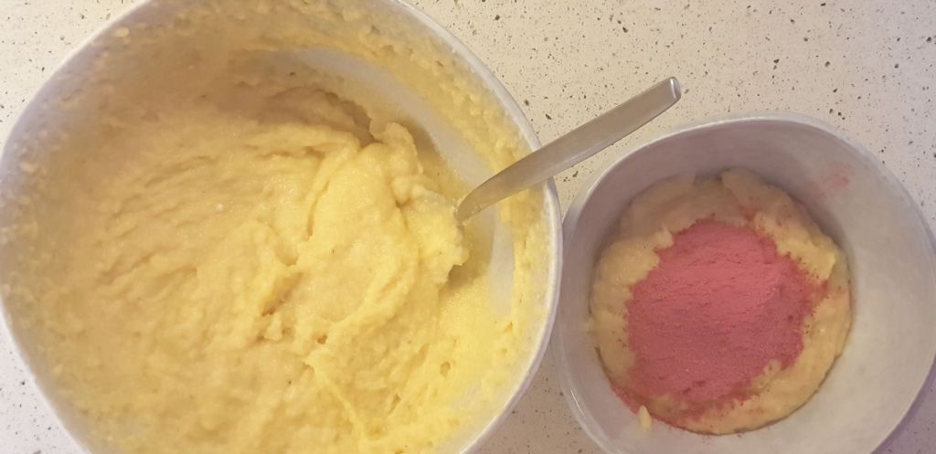 Отделете около 1/3 от цялото количество тесто в друга купа. Добавете праха от малини и допълнителната лъжица кокосова сметана и разбийте.
