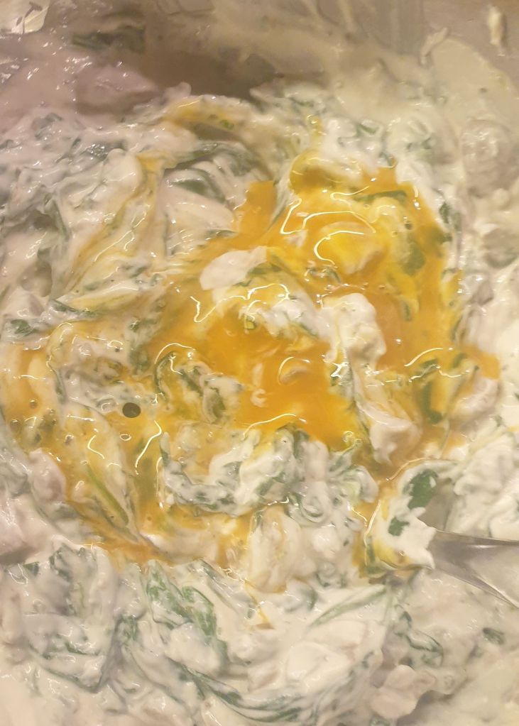 Загрейте зехтина и добавете спанака и гъбите. Гответе 3 – 4 минути и добавете чесъна. Добавете изварата и разбъркайте добре, след което свалете от котлона. Добавете жълтъка и мащерката.