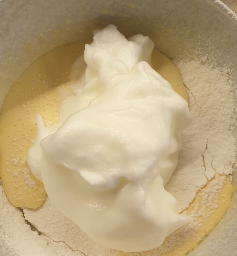 Добавете около 1/3 от белтъците и разбъркайте с шпатула, като внимавате да запазите обема. Добавете и останалите белтъци на части и разбъркайте, докато се поемат напълно.