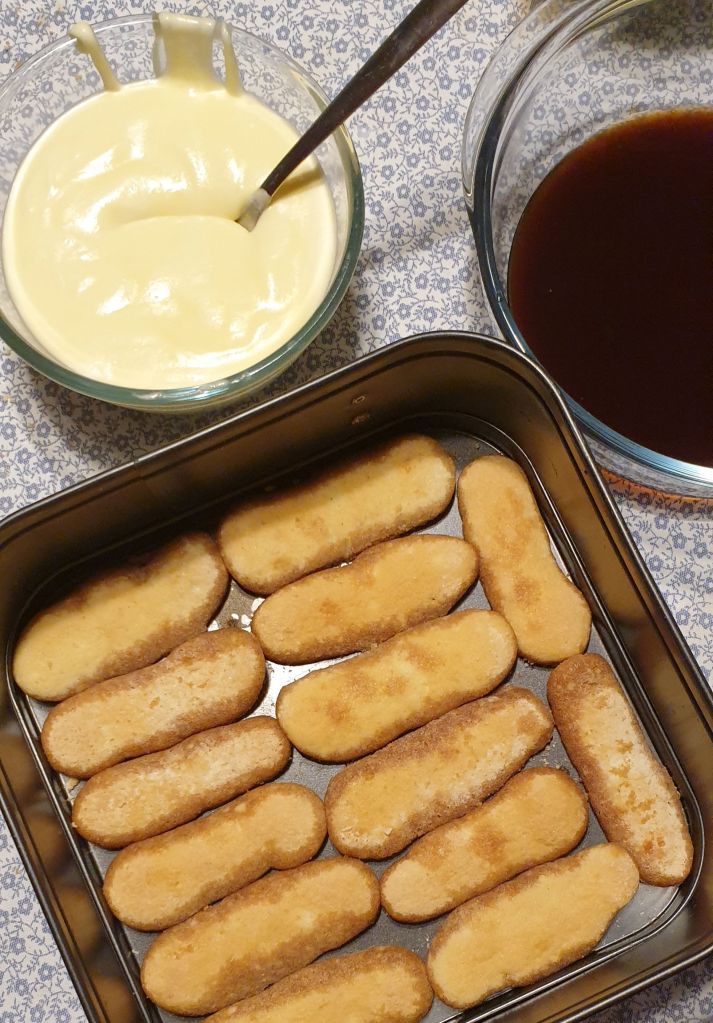 Миналата година правих Шарлота с домашни бишкоти. Идеята беше тирамисуто да последва скоро след това, но не останах достатъчно доволна от бишкотите и затова плановете се отложиха.