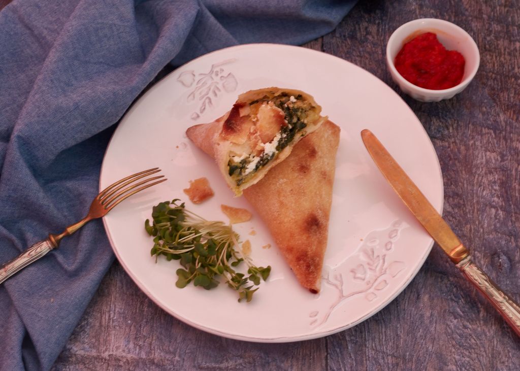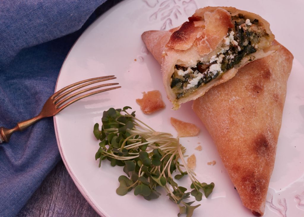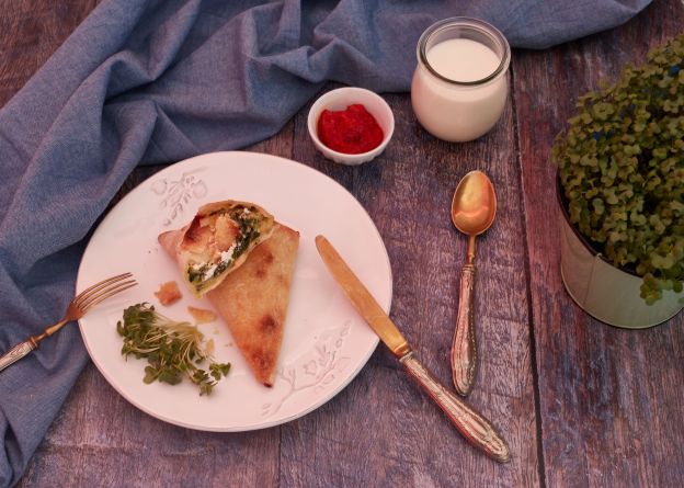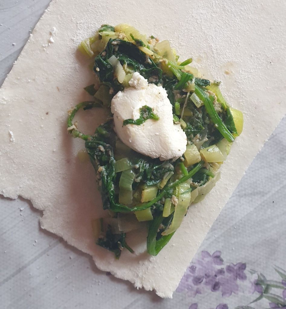 Понеже е пролет, режих да я направя зелена – с праз, спанак и магданоз. В пълнежа има едно яйце и извара от козе сирене, които може да пропуснете, ако искате веган банички. Може също да добавите месо, сирене или каквото друго ви се хапва в момента – пълнежът е изцяло по ваше желание. Това, което съм дала по-долу е просто пример.