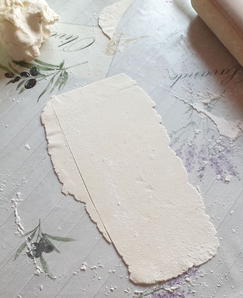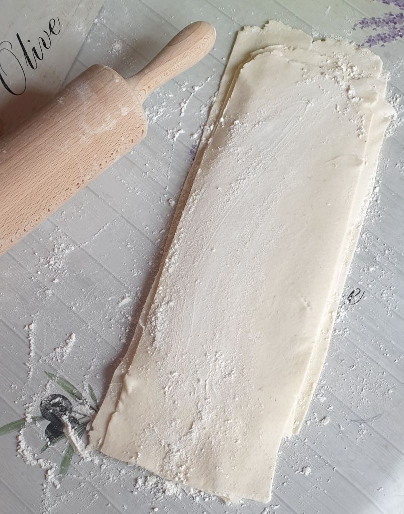 Общото тегло на тестото е около 550 – 560 г. След престоя на хладно, разделете на 7 равни части, всяка около 80 г. Наръсете плота обилно с брашно и разточете правоъгълни кори с размер около 30 – 32 см на 12 – 13 см. Изрежете неравните краища.