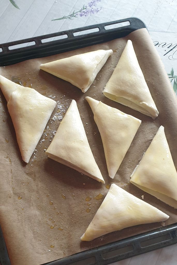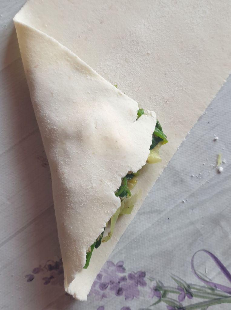 Вземете една кора, намажете я със зехтин или разтопено масло и поставете 1 и 1/2 до 2 с.л. от пълнежа в единия край. Сложете и една препълнена лъжица извара (около 10 г). Завийте на триъгълник.