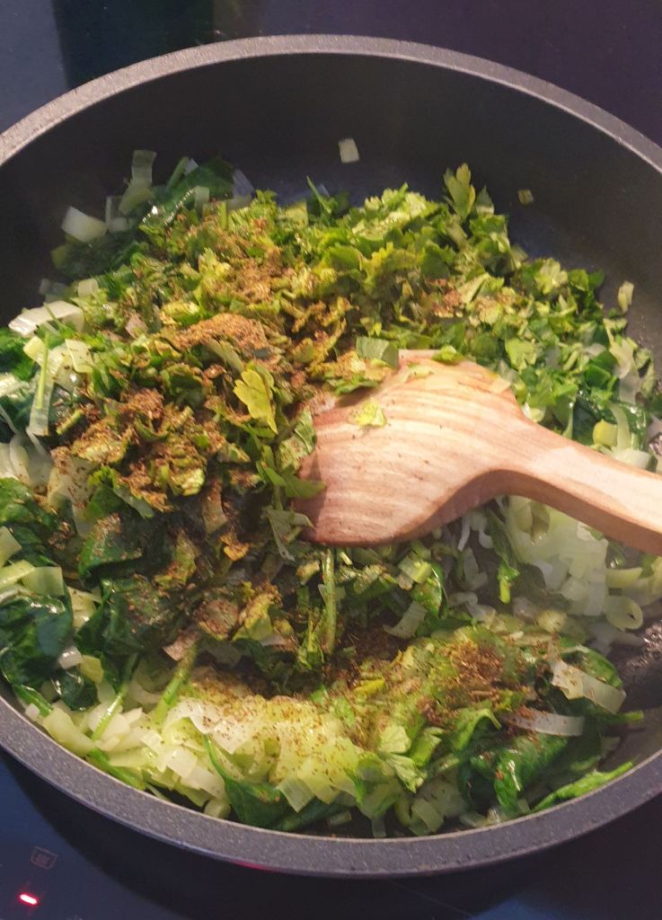 Загрейте зехтина в тиган с дебело дъно на средна степен на котлона. Добавете ситно нарязания праз и гответе 2 – 3 минути, докато омекне. Добавете почистения спанак и нарязания магданоз и гответе още около минута. Подправете и разбъркайте. Свалете от котлона. Ако ще слагате яйце, добавете го сега, предварително разбито. Сместа е топла и яйцето ще се сготви веднага. Разбъркайте и опитайте на сол (не съм предвидила, защото има в готовата смес от подправки).