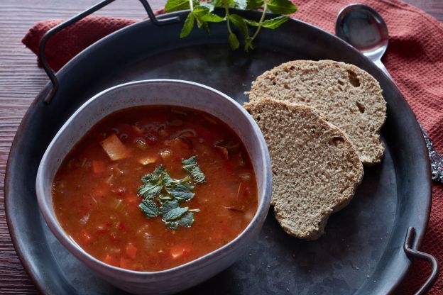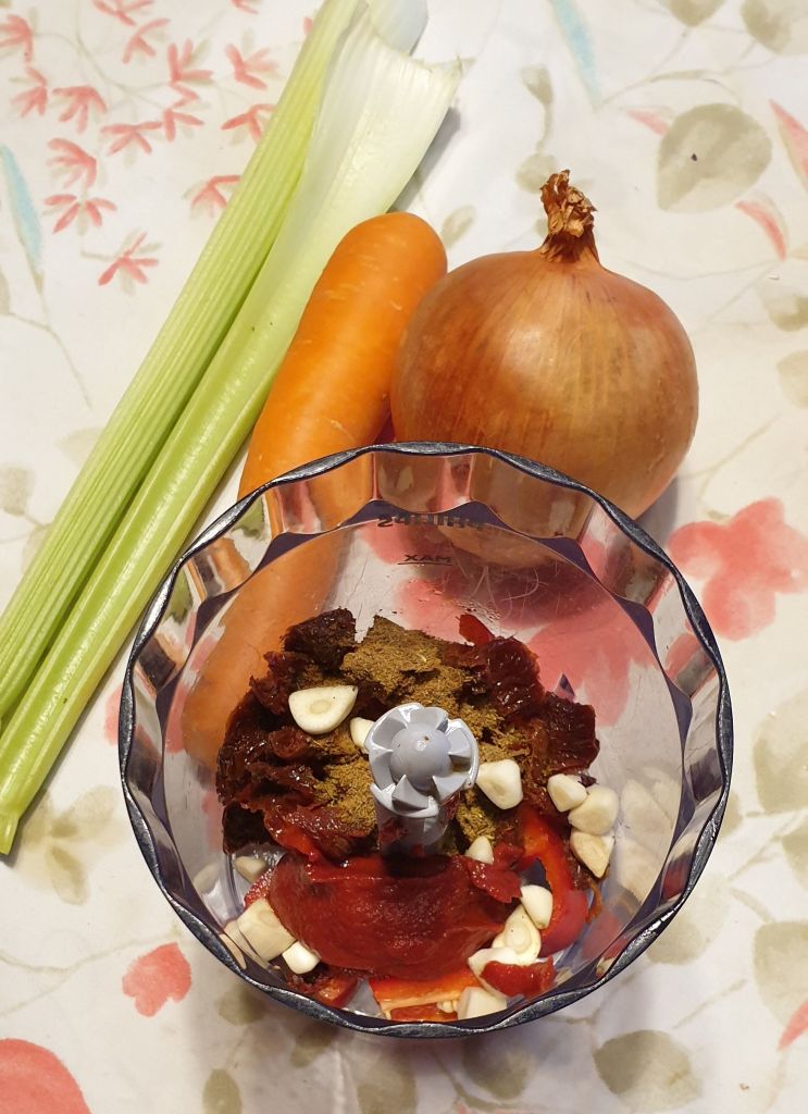 В чашата на блендер смесете нарязаните чушка, сушени домати и чесън с доматеното пюре и сместа от сухи подправки. Направете на грубо смляна паста (ако е необходимо, добавете 1 или повече с.л. вода). Оставете на страна.